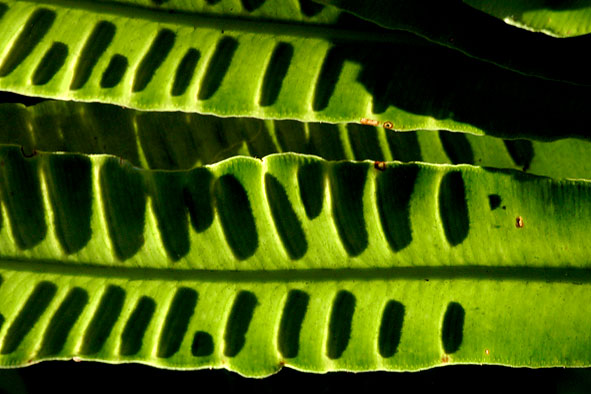 abstraction de deux "M" naturalistes par contre-jour au travers d'une feuille sur les sporanges de la fougère 'scolopendre'