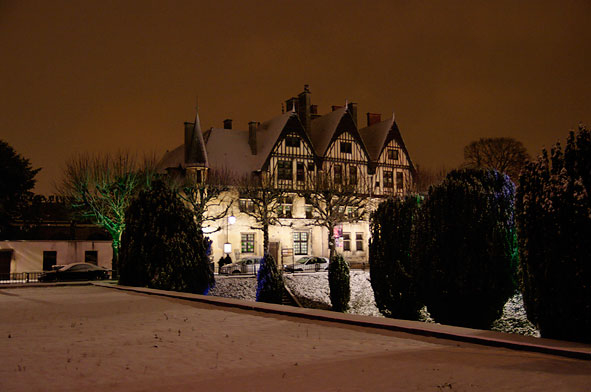 "M" inscrit dans le ciel neigeux de Reims sur la façade néogothique de l'Hôtel Le Vergeur par la découpe de sa toiture
