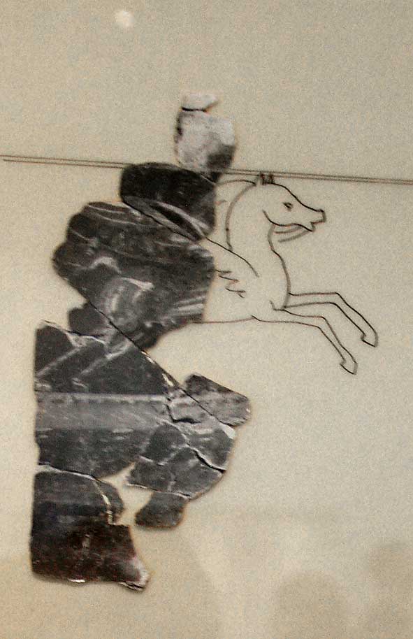 Des fragments d’enduits colorés seront éventuellement restitués par le dessin, ce que ne permet pas l’examen visuel direct de la fresque; ainsi ce Pégase analysé par C. Allagh et Ph. Sestret