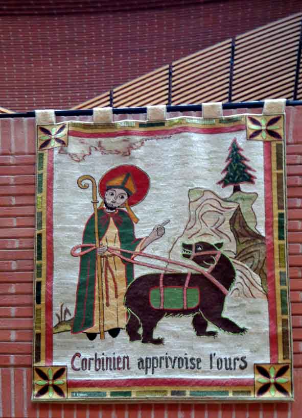 Cet ours est celui qui fut transformé par Corbinien de dévoreur en porteur, l’un de ces miracles appréciés de nos ancêtres. Corbinien né dans les parages de Saint-Germain-les-Arpajon en 680 se rendit à Rome où il fut nommé évêque de Freising, cité qu’il évangélisa et en fit le siège de la cathédrale de Bavière. L’animal est donc célèbre dans le diocèse de Münich-Freising et figure dans les armoiries du pape Benoît XVI. Celui qui marche sur cette tapisserie est l’oeuvre de Soeur Marie-Dominique de l’abbaye de Limon. Quant au saint il mourut en 730 au monastère de WeihenStephan et ses reliques reposent dans la cathédrale de Freising.