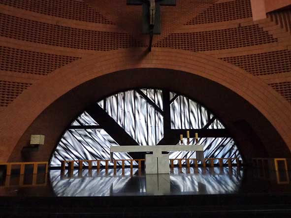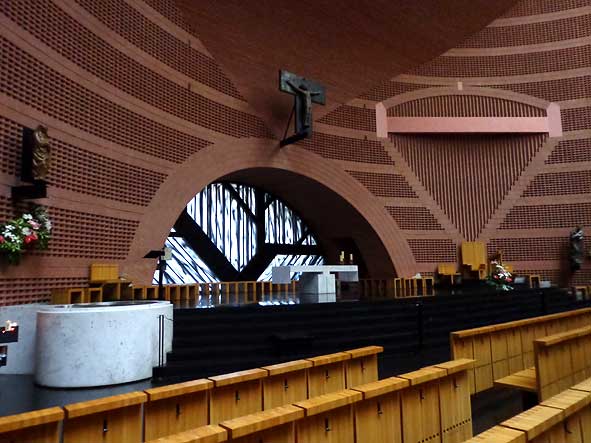 Dedans, en sa coque briquée, surgit le choeur, serti dans un écrin qu’un fermoir de verre et d’acier transfigure dans une étrange lumière moirée que l’élan des prières vacillantes mais soutenues par les lignes de force de l’alignement des clairs bancs de bois et des structures de briques auréole. Il règne dans une majesté contemporaine comme insensible au temps.
