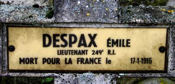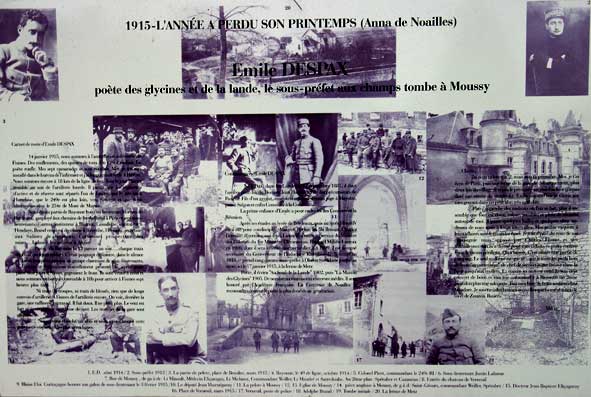 Vous trouverez de nombreux renseignements sur plusieurs sites internet ; l’étude de Louis Férin, Emile Despax, le sous-préfet aux champs, Graines d’histoire, n°5, mars 1999 est une synthèse intéressante sur cet auteur et son bref mais définitif séjour au Chemin des Dames. Sa tombe est au cimetière de Moussy-Verneuil, la commune lui rend hommage chaque 11 novembre et une plaque émaillée raconte son parcours. Sa composition, texte et graphisme, est de Louis et Olivier Férin.