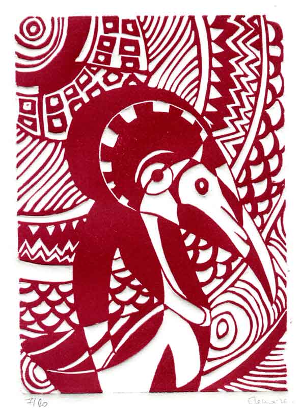 Ainsi encore une artiste graveuse rémoise, Emmanuelle Lemaire, sculpte sur linoleum et imprime en fort gaufrage un ‘oiseau’ qu’il me plaît de nommer encore ‘toucan’ :