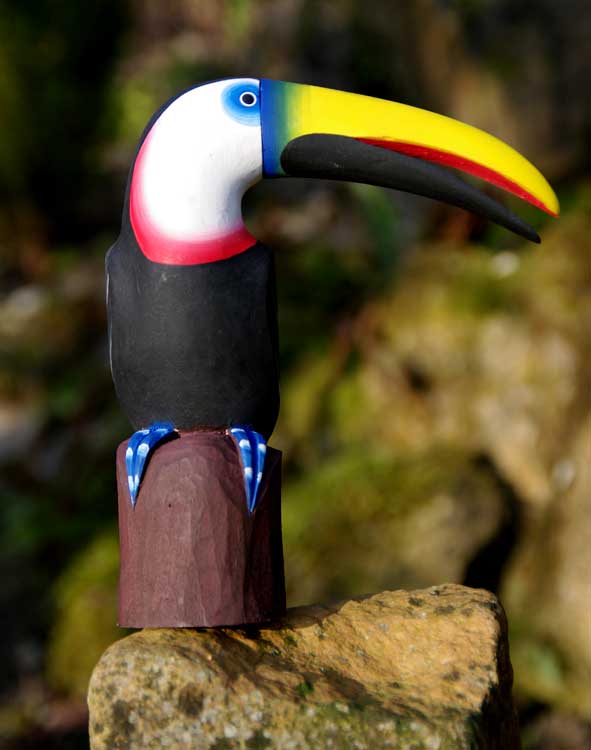 Ainsi des artisans colombiens reproduisent des figurines de ces oiseaux au profil inoubliable et aux couleurs chatoyantes :