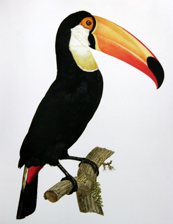 En 1806 Jacques Barraband grave un toucan toco (Ramphastos toco) que d’habiles imprimeurs magnifient d’une coloration ‘à la poupée’ pour l’ouvrage de François Le Vaillant, Histoire naturelle des oiseaux de paradis, vol. II, 1ère partie : histoire naturelle des toucans, planche 2. Cette gravure parmi quantité d’autres est reproduite avec grand soin dans l’ouvrage « Oiseaux » de Katrina Cook, Citadelles variations, 2008, p.57 ( depuis’the Stapleton Collection‘ pour cette planche),
