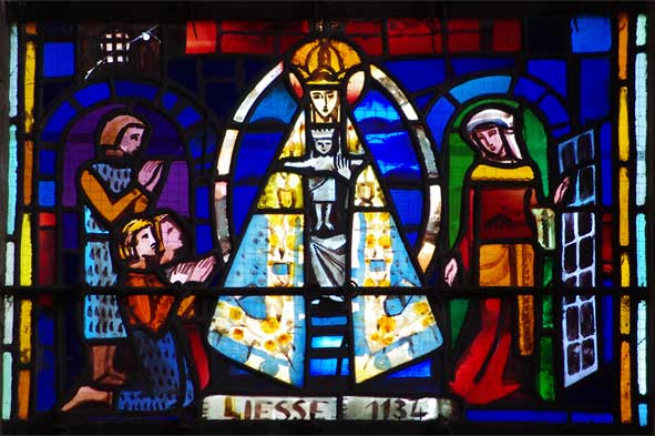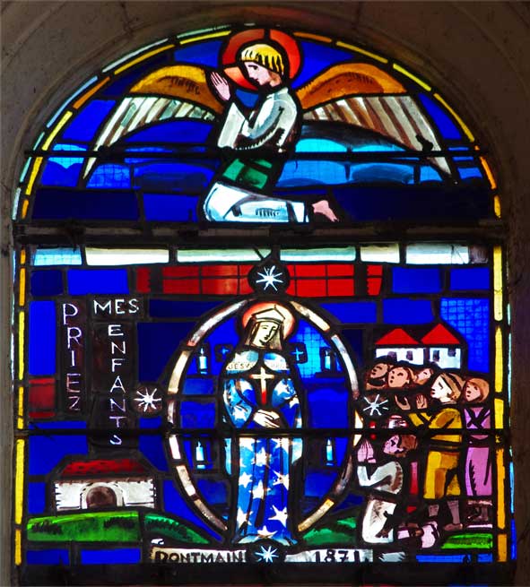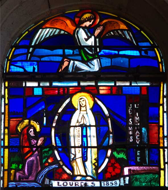 A la suite des créations de Maurice Denis des paroissiens de Fère prirent goût à ces nouvelles lumières, à ces productions d’artistes contemporains et décidèrent d’implanter une nouvelle verrière en 1938. Le sujet en fut le troisième centenaire du Voeu de Louis XIII qui avait placé le royaume de France sous la protection de la Vierge en 1638. Cependant la guerre survient et la fenêtre ne fut posée qu’en 1943. Elle fut réalisée par le célèbre Atelier Jacques Simon de Reims qui illustra le thème des apparitions de la Vierge en France. Ainsi peut-on observer et lire par ordre chronologique : Liesse 1134 ; Voeu de Louis XIII 1638 ; Paris 1830 (rue du Bac) ; La Salette 1846 ; Lourdes 1858 ; Pontmain 1871.