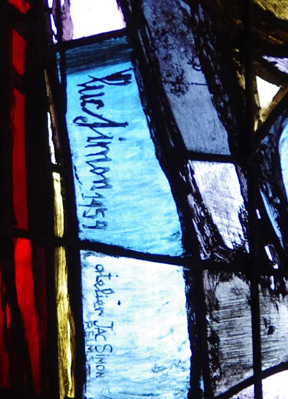 Le goût de la lumière colorée vient en voyant. Aussi bien d’autres yeux eurent bientôt faim de nouveaux éclats. Au moment de la création du dépôt des Monuments Historiques en 1955 il a été décidé de ne pas réinstaller en place les verrières de Maurice Denis et de mettre dans le choeur de nouvelles baies confiées à l’atelier Jacques Simon et dessinées par Luc Simon. Elles sont signées par Luc Simon en 1959. Ainsi comme dans les premiers jours heureux de la création fut projetée dans Sainte-Macre une neuve lumière.