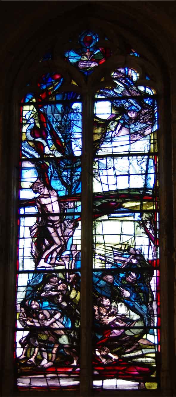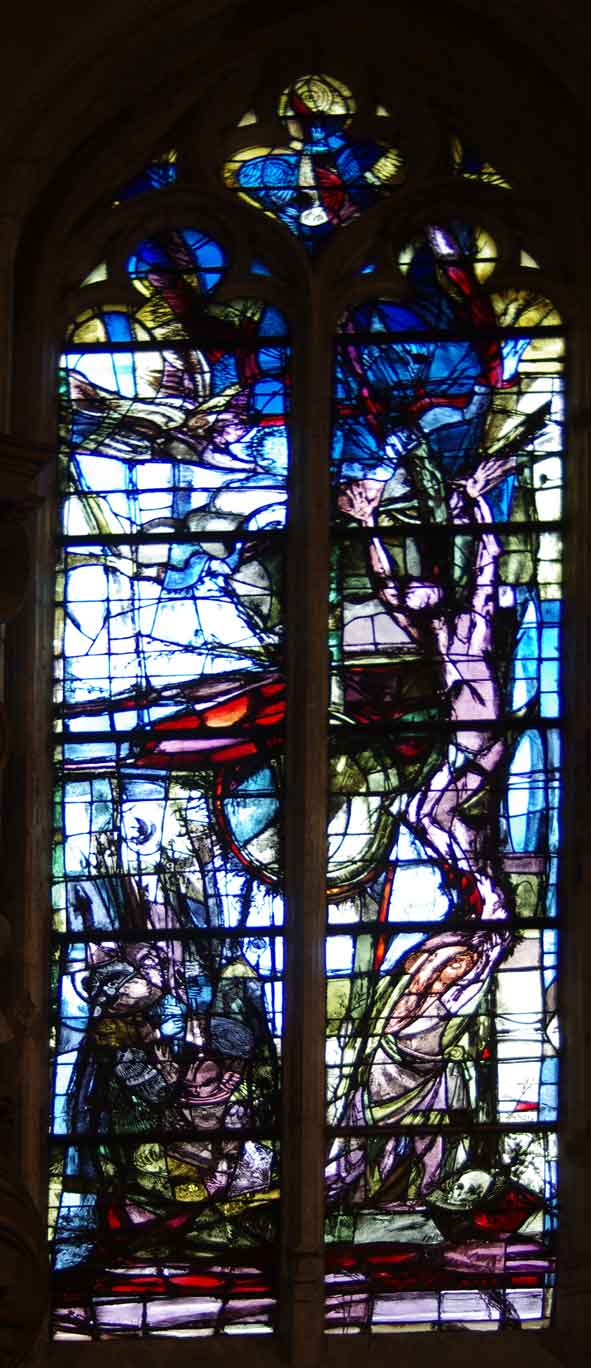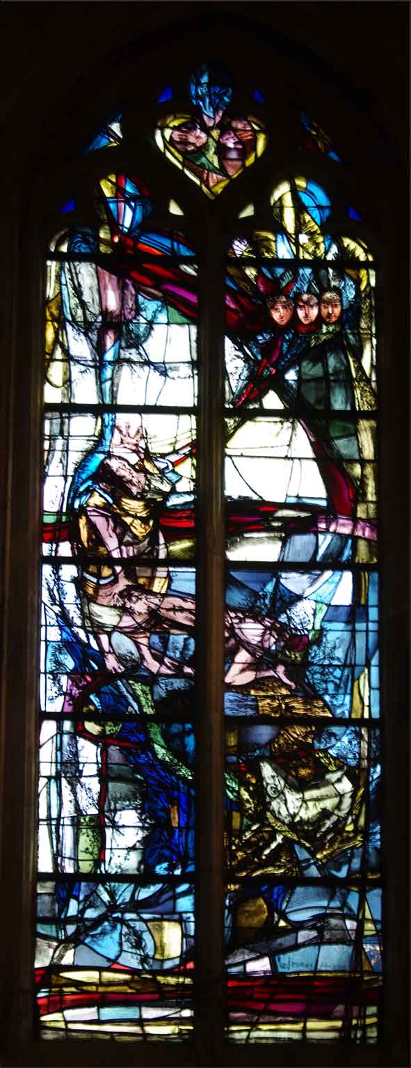 Les vitraux de Luc Simon ornent des scènes bibliques connues et présentent un graphisme tendu qui soutient des couleurs subtilement dosées.