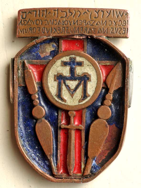 La symbolique de l’ensemble s’inspire fortement de la représentation de l’apparition de Marie, rue du Bac en 1830, telle qu’on peut la voir encore de nos jours. En effet le M surmonté de la croix, la prière gravée du boîtier sont comme l’avers et le revers du tableau de la vision telle qu’elle est décrite par Catherine Labouré et les douze apôtres des plaquettes créent comme une symétrie aux douze étoiles de la vision, tout comme du reste l’inscription du cartel à lire ‘en inversant’ ou retournant l’image. Les six annelets qui relient les plaquettes gravées au nom d’un saint sont en nickel-chrome, les autres en cuivre, ce n’est pas non plus un hasard. On doit probablement considérer ce collier comme une assurance de protection divine pour celui qui le porte et même davantage pour un croyant. Ouvert par son porteur et expliqué ce pendentif constitue une véritable catéchèse, qu’un Lazariste, par exemple, aurait pu avoir fait réaliser. Très usé il fut longuement porté. L’image de la Sainte-Face avec sa coulée de sang expliciterait la couronne d’épines, absente en elle-même, alors que le glaive de la vision est présent. Le deuxième coeur de la ‘médaille miraculeuse’ figure un coeur transpercé d’un glaive même si les cœurs manquent par rapport à la figuration de la rue du Bac. En revanche l’inscription développée du titulus « INRI » vient en plus, elle complète bien la Sainte Face et le sang. Ce n’est donc pas intégralement la médaille de la rue du Bac, souvent présente chez les combattants, qui est reproduite ici stricto sensu, mais son contenu spirituel interprété autrement. Nous sommes en présence d’une véritable œuvre de l’esprit et de la main.