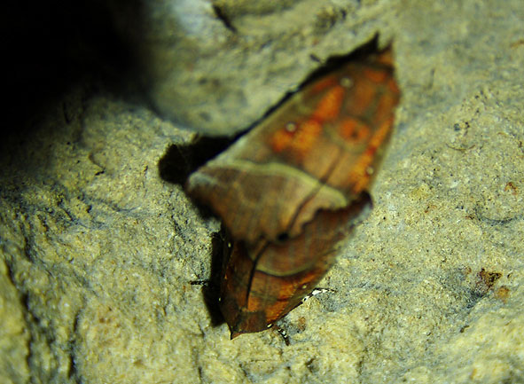 Ce couvercle enlevé on découvre successivement trois morceaux de papier découpés à la taille du fond de la boîte et une feuille de métal jaune brillant qui exerce une force de ressort ; elle épouse la forme générale du dessin qu’elle recouvre, ce dessin étant lui-même la reprise agrandie d’un motif -une coulée de sang- figurant sur la feuille du dessous comme nous décrivons ci-après.