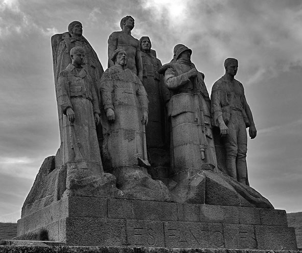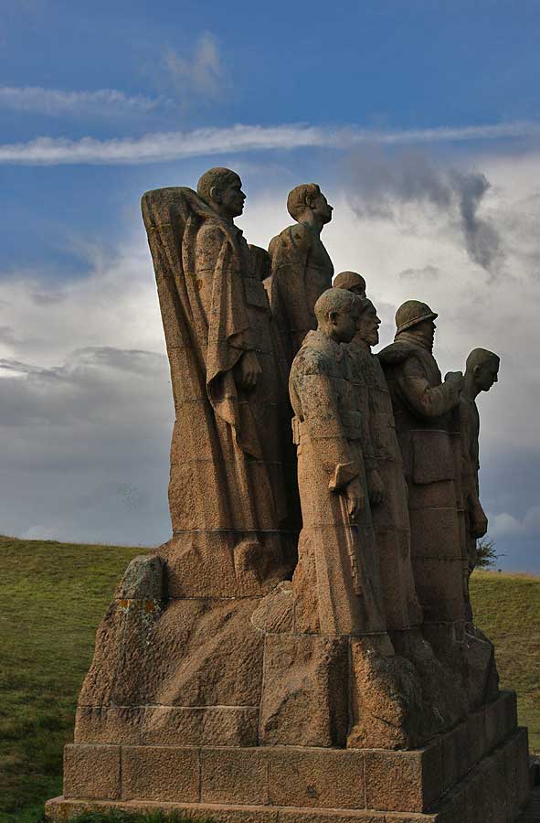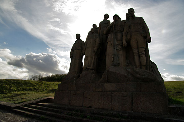 Sept hommes lourdement équipés, sept combattants des différentes armes engagées dans la Grande Guerre. On ne sait trop qui est le huitième, bien présent et tout aussi absent au groupe ; il s’envole. En bas, 250 mètres plus loin, « la France », forte femme que protègent trois boucliers assignés à la devise républicaine, les devance, leur montre la voie de la victoire tant attendue après quatre années de combats symbolisées par les quatre terrasses successives.