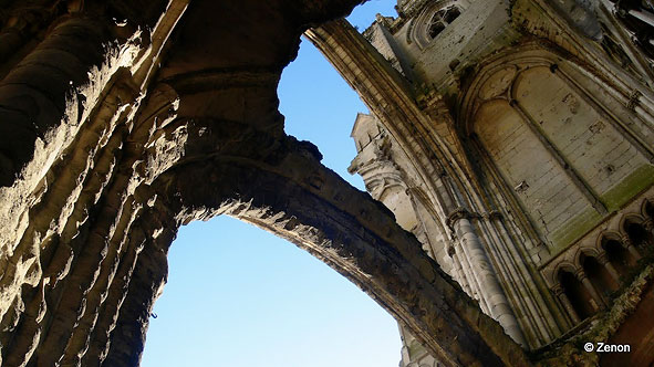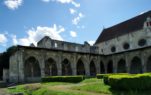 L’idée est-elle bonne d’en chercher là où chacun jette un oeil ici et là au cours de sa promenade ? A vérifier. Nous voici d’abord en un lieu cher aux Soissonnais et à d’autres aussi, un lieu et monument quasiment emblématique de la ville après le vase, les deux étant brisés : Saint-Jean-des-Vignes. Sa façade découpée captive toujours les regards, reliée au réfectoire qui lui est contemporain ; cet ensemble étant édifié autour des années 1220.