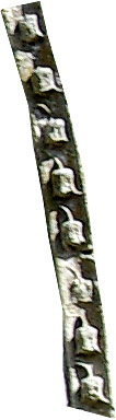Au-dessus de cette boîte est soudé un cartel gravé sur trois lignes. Cet écrit est gravé à l’envers sur le pendentif, on peut donc le lire à l’endroit avec un miroir posé perpendiculairement à ce dernier.