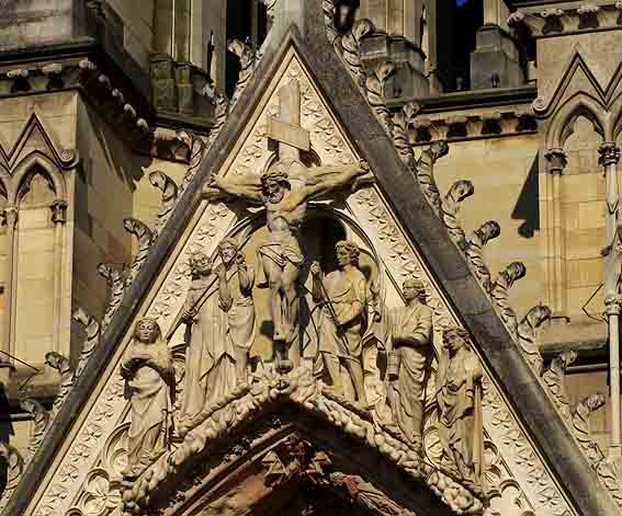 Le portail nord, celui de la Crucifixion accueille l’hermine (ou la belette, mais l’hermine semble plus accordée à l’esprit du temps). Comme dans la nature elle se dresse pour regarder à l’entour, elle paraît joueuse ou curieuse, bien observée par le sculpteur qui a su rendre sa posture.