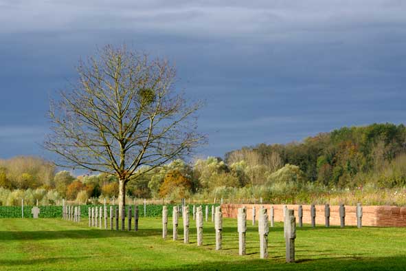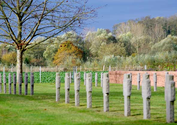 L’extraordinaire du jour fut pour moi la soudaine apparition du soleil derrière l’écran des vapeurs et nuages d’automne soudain dévoilé et déchiré. Dans le lugubre mais organisé « décor » que constituent croix, grès, semis, granite de nos nécropoles (ici alentour ce ne sont pas moins de 22 371 dépouilles gisantes sous nos pieds, toutes nations confondues) tout à coup, vers les onze heures, l’été de la Saint-Martin explosa. On entend en France par cette expression une remontée assez fréquente des températures autour du 11 novembre, fête de saint Martin instituée lors de son inhumation le 11 novembre 397. A cette occasion l’hagiographie du saint relate le fleurissement soudain de nombreux arbustes le long de la Loire entre Candes et Tours. Toujours est-il qu’en ce 9 novembre 2014 par une température très douce voici illuminés le paysage vers l’ouest et la prairie fleurie qui couvre l’ossuaire du cimetière allemand. Jugez-en :