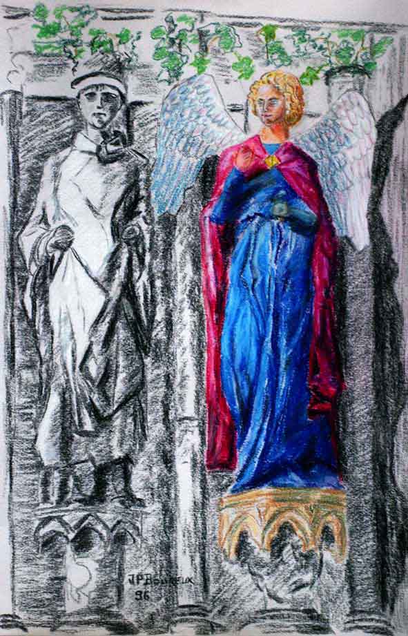 pastel réalisé par mes soins en 1996 avant que ne se soient répandues les reconstitutions virtuelles colorées sur les monuments. Ci-dessous l’ange au sourire projeté sur la façade de la cathédrale lors de l’une de ces soirées-spectacles par ailleurs évocatrices de certaines formes du passé, même si le contenu ‘scientifique’ est laissé de côté.