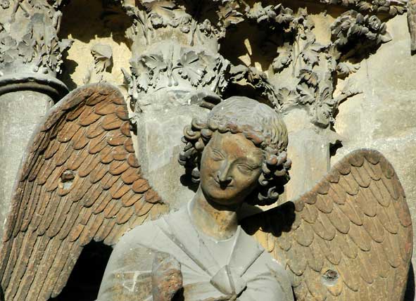 l’‘Ange au sourire’ tel qu’il sourit en 2013 sur le portail latéral nord de la façade de la cathédrale Notre-Dame de Reims