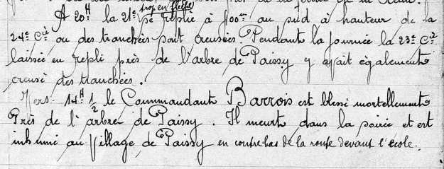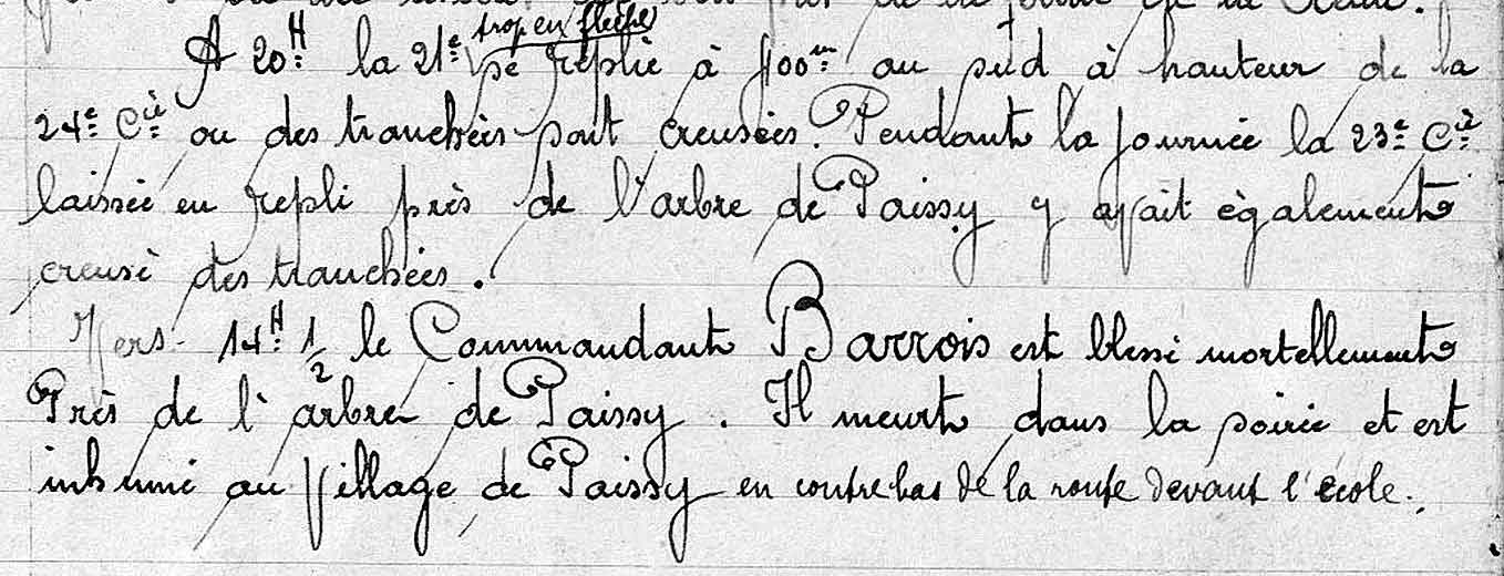 extrait du Journal des Marche et Opérations du 4ème RTA en septembre 1914 mentionnant "l'arbre de Paissy" et le décès du Commandant Barrois
