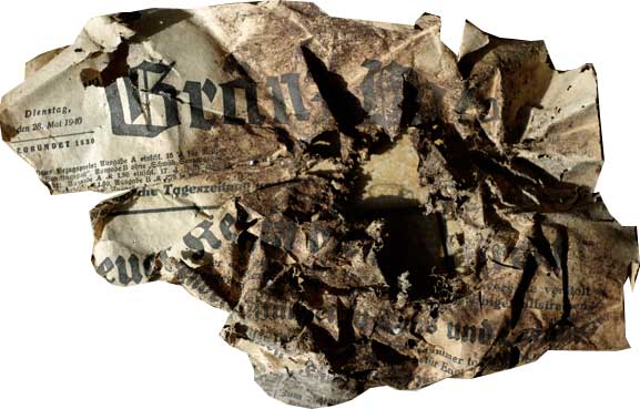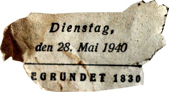 fragment de journal allemand du 28 mai 1940Trace infime, trace impondérable du passage d’une troupe allemande dans les creuttes de Paissy aux environs du mardi 28 mai 1940 comme il est écrit ici. Une recherche rapide m’apprend que les Allemands occupent Laon le 17 mai 1940 et que les armées françaises en recul font sauter tous les ponts sur l’Aisne le 20 mai entre Soissons et Neufchâtel-sur-Aisne. Des soldats du IIIe Reich peuvent donc être à Paissy entre le 18 mai et ce 20 mai et notre journal a été abandonné par un des leurs environ une semaine après leur entrée dans ce terroir. A moins qu’il ne s’agisse d’une arrivée un peu plus tardive encore, après notre temporaire victoire de Montcornet-Sissonne contre les divisions blindées, à l’initiative de De Gaulle et de ses chars le 24 mai. Quoi qu’il en soit ce journal est une preuve infime et insignifiante de l’Occupation, entre exode et retour des populations civiles.