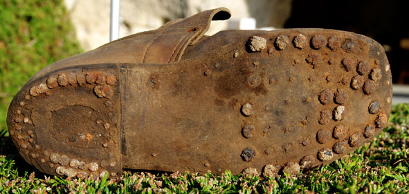 brodequin de poiluavant du souliersemelle de brodequin de poiluEn ont-ils fait des kilomètres tous ces poilus dont certains ont achevé leur parcours dans les ravins qui jouxtent cette cave, ravins de la Dhuys et du Mourson, de Paissy, de Troyon…. !  Sans cesse affleurent sur ce champ de bataille des débris en tout genre qui témoignent de ces vies stupidement fauchées. Il n’est pas même nécessaire que la mémoire agisse par elle-même, sans raison apparente, chaque découverte fortuite nous entraîne dans le souvenir douloureux de ces quatre années de cauchemar.