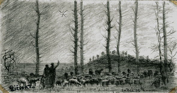 J’ai choisi l’atmosphère d’un couchant de fin d’automne, un dessin de saison, une date anniversaire : 20 décembre 1904. Sous un petit format L.-H. Liévrat offre un crépuscule tout en nuances et un clin d’oeil biblique à la saison. Il s’agit presque d’une allusion tant le signe est discret. L’un des deux bergers a le bras levé et son doigt pointe quelque chose dans le ciel, que son compagnon observe de concert. Une certaine attention est nécessaire pour détecter, non un ovni, mais les rayons d’une étoile. En effet les rayons de l’étoile, -car c’est bien une étoile qui s’allume dans un ciel plombé, présentent quelque similitude avec les branches qui hérissent les troncs maigres de jeunes ormes. Presque un message crypté où seul un berger peut retrouver la brebis égarée, ou un spectateur le sens caché de la scène par ailleurs baignée d’une lumière très habilement rendue.