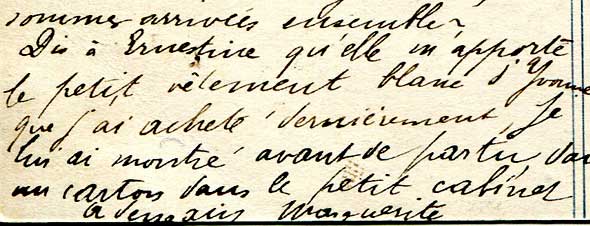 « …dis à Ernestine qu’elle m’apporte le petit vêtement blanc d’Yvonne que j’ai acheté dernièrement, je lui ai montré avant de partir, dans un carton dans le petit cabinet. A demain Marguerite.«