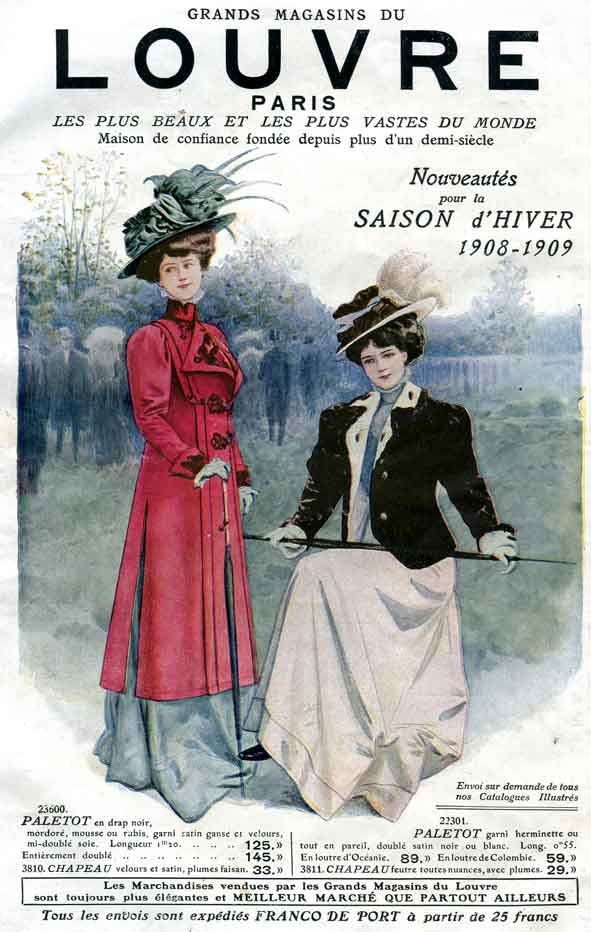 On peut imaginer que les clientes trouvaient là l’essentiel de leurs besoins en habillement et qu’il n’était pas nécessaire qu’elles entreprennent un déplacement à Paris ou à Reims. Elles pouvaient étoffer leur curiosité en consultant les catalogues illustrés des grands magasins parisiens par exemple dont voici des extraits d’exemplaires contemporains.