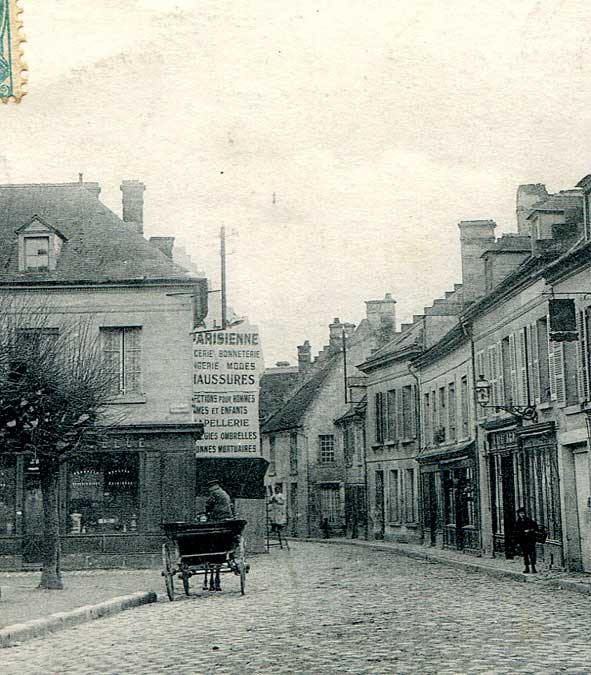 Le bandeau de corniche porte : « A la Parisienne » et entre les fenêtres de l’étage se lisent : « chemises, corsets, cravates, foulards, articles de voyage, maroquinerie, vêtements, confection et sur mesure« . L’appellation est reproduite sur le front de vitrine, à sa gauche est illisible un article en vente, à sa droite on lit : « bonneterie« . Entre les vitres de vitrine on peut encore lire : « lingerie, chaussures, confection pour dames, soieries, doublures, brosserie, tapis« . D’autres titres ne sont pas lisibles. Sur son ‘pas de porte’ la propriétaire est en discussion avec deux dames, un homme observe de loin le photographe en action. D’autres devantures annoncent une rue ‘commerçante’ active dans le cadre d’un chef-lieu de canton qui compte environ 2000 habitants. Le trottoir est étroit, la rue pavée. Elle le restera jusqu’aux années 50 bien que son tracé ait été rectifié après les destructions de la guerre. On aperçoit ci-dessous tout au bout de la rue une partie de ce magasin, dernière boutique en saillie avant la Place du Général Félix devant l’église. Suit une vue de cette rue détruite lors de la guerre.